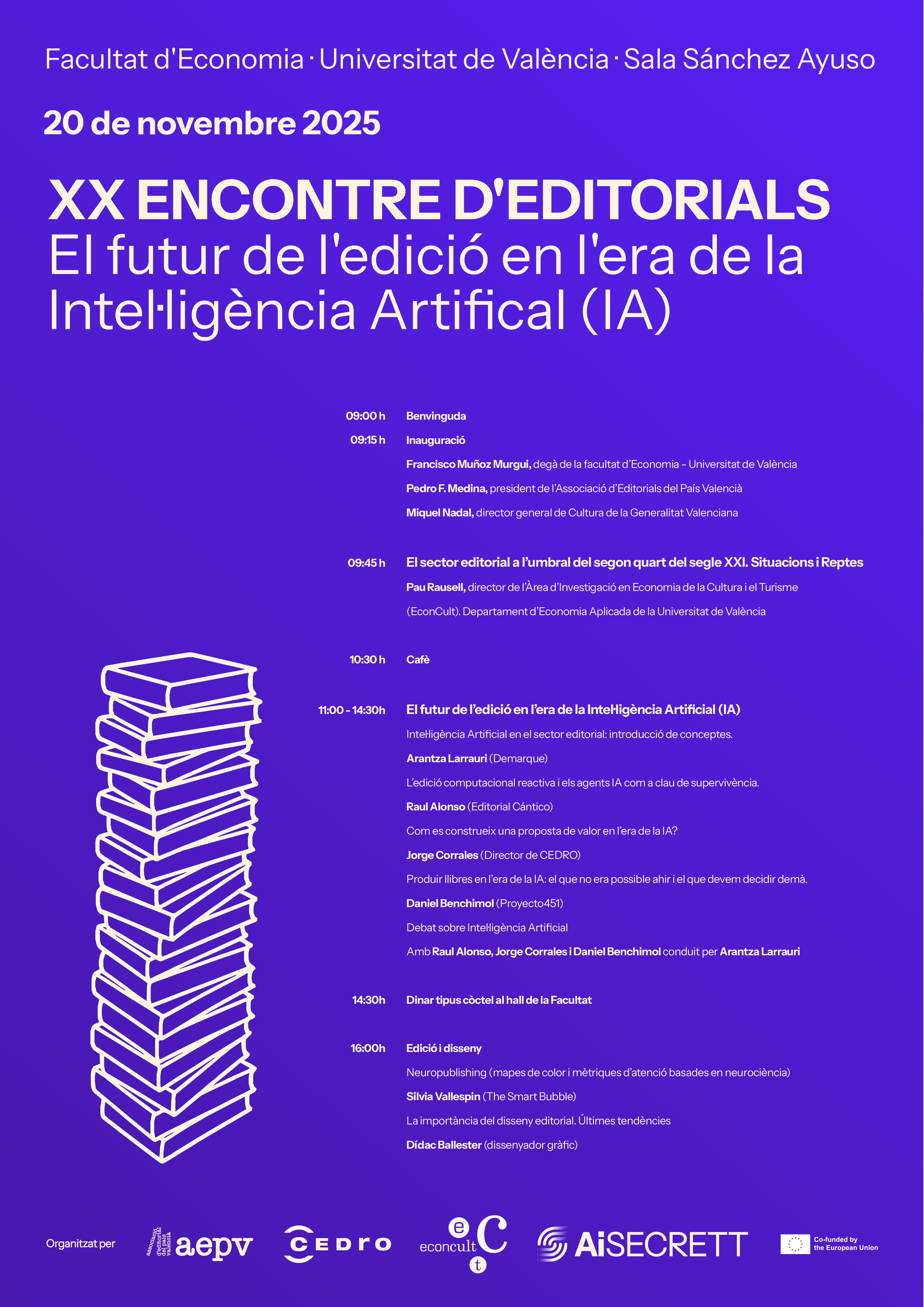 Organised by the AEPV (Publishers’ Association of the Valencian Region) with the collaboration of the University, CEDRO, the Valencian Anti-Fraud Agency and the EU-funded AiSECRET project, the programme addressed key issues such as green publishing, rights management, digital innovation and the future of creative labour.