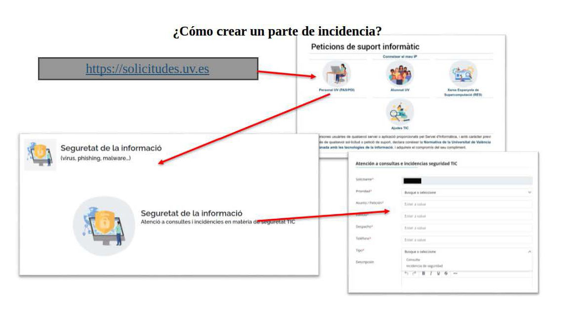 En la imatge següent es pot veure el procés establit per a la comunicació d'incidències de seguretat a la Universitat de València.