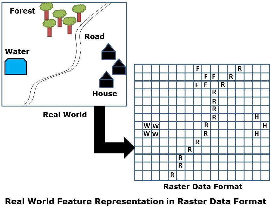 En los datos de tipo raster, las entidades del mundo real se representan mediante una malla regular de celdas, donde cada celda contiene un valor. Los rasters son efectivos para representar datos que varían continuamente, como la elevación, la temperatura, o imágenes satelitales.