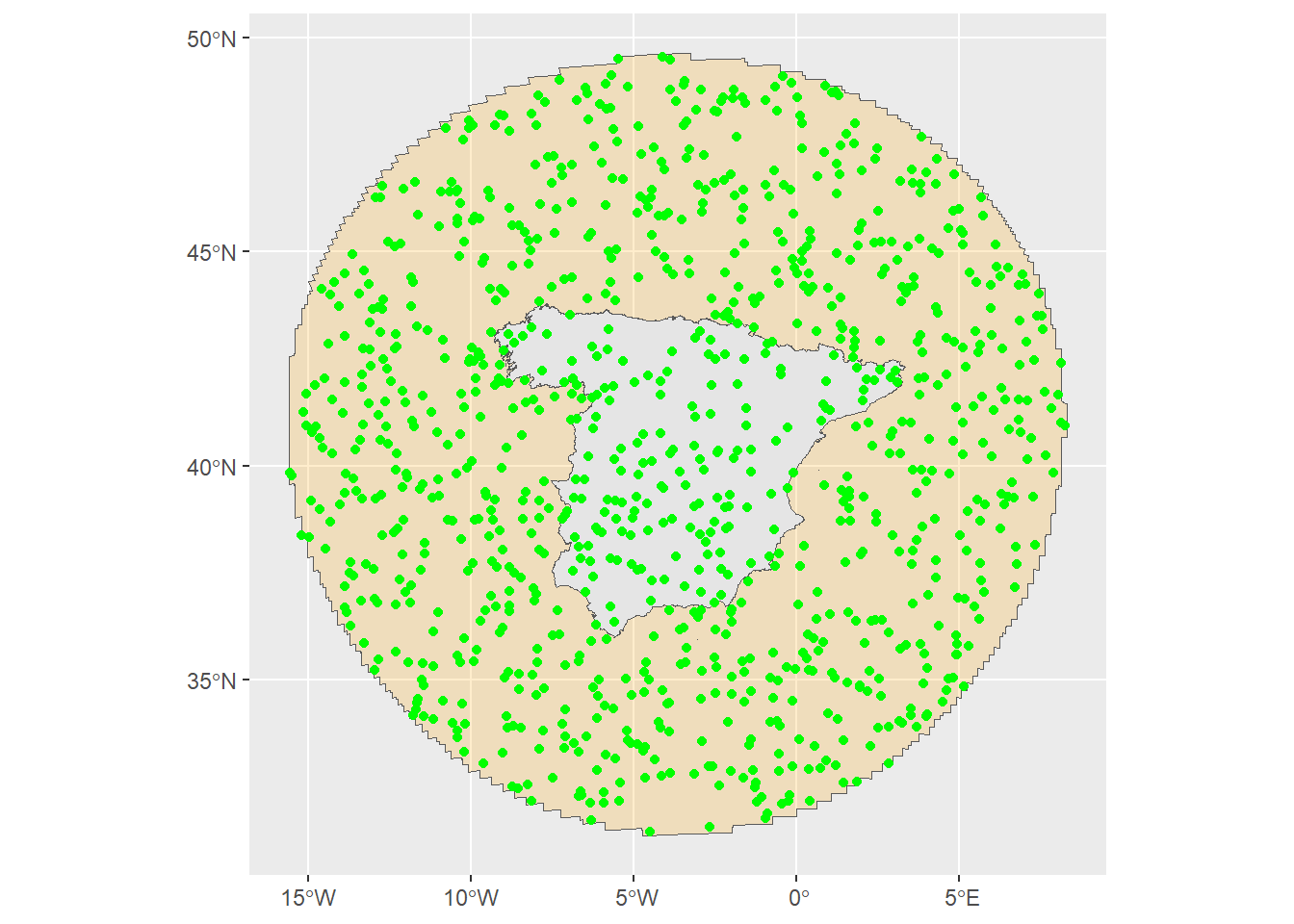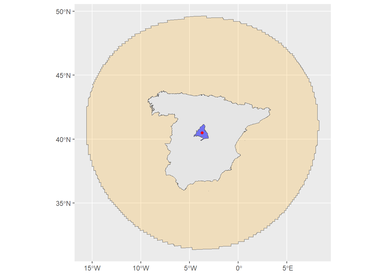 buffer <- st_buffer(centro_madrid, dist = 10^6) # buffer 1000 km desde centro madrid