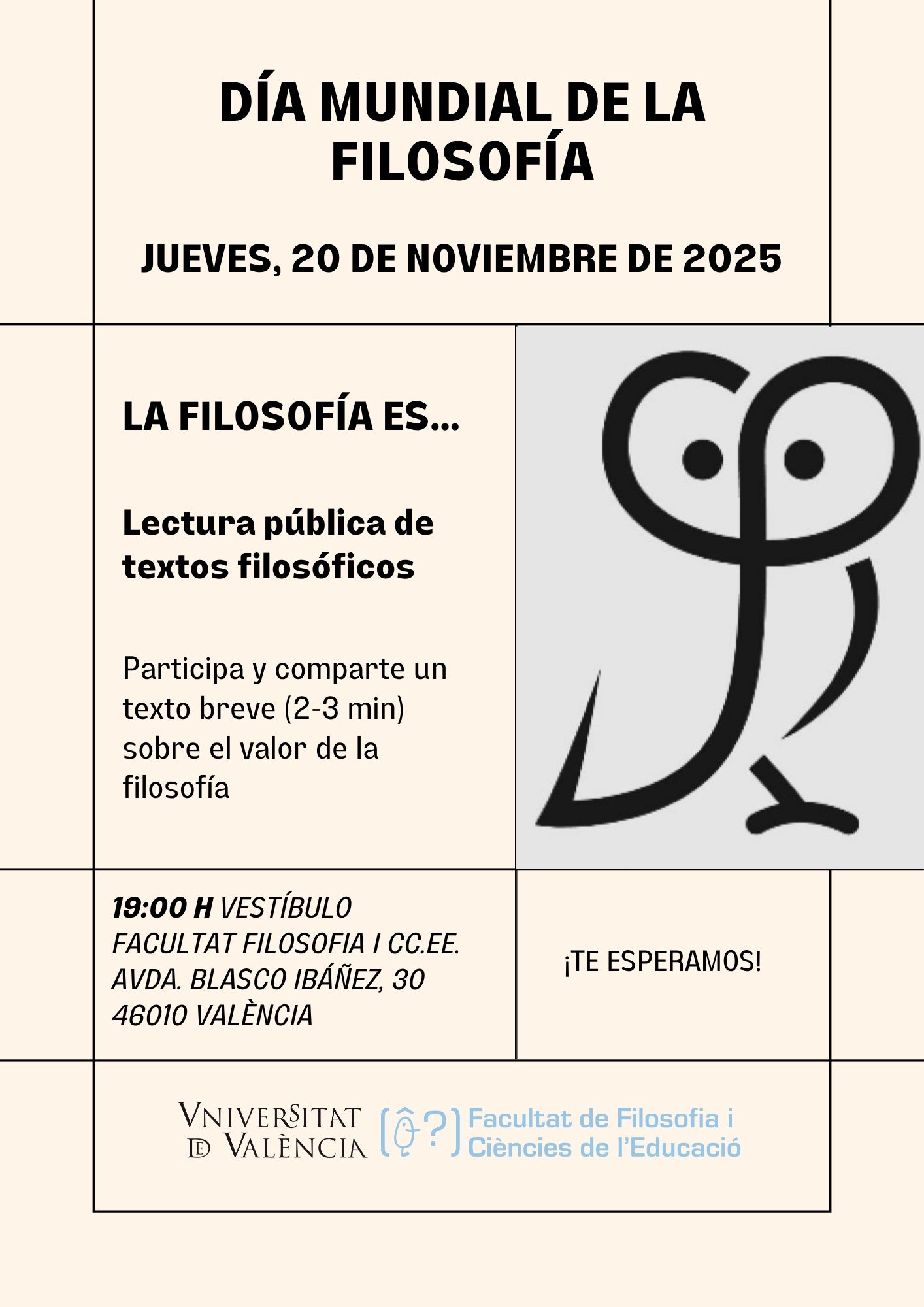 Para conmemorar este Día, bajo el título “La filosofía es…”, el jueves, día 20, se ha organizado en la Facultat de Filosofía i Ciències de l’Educació una lectura pública de textos filosóficos.