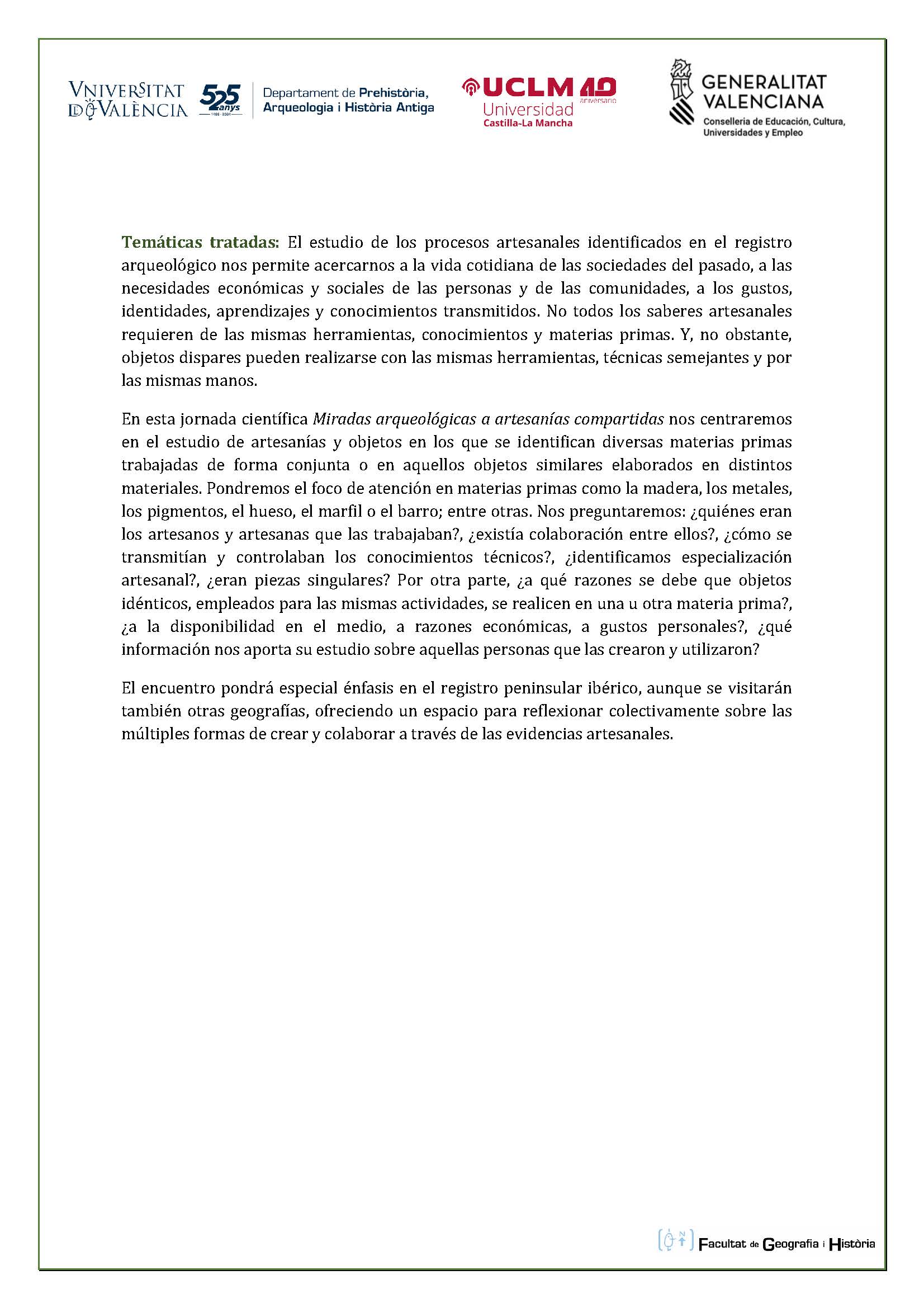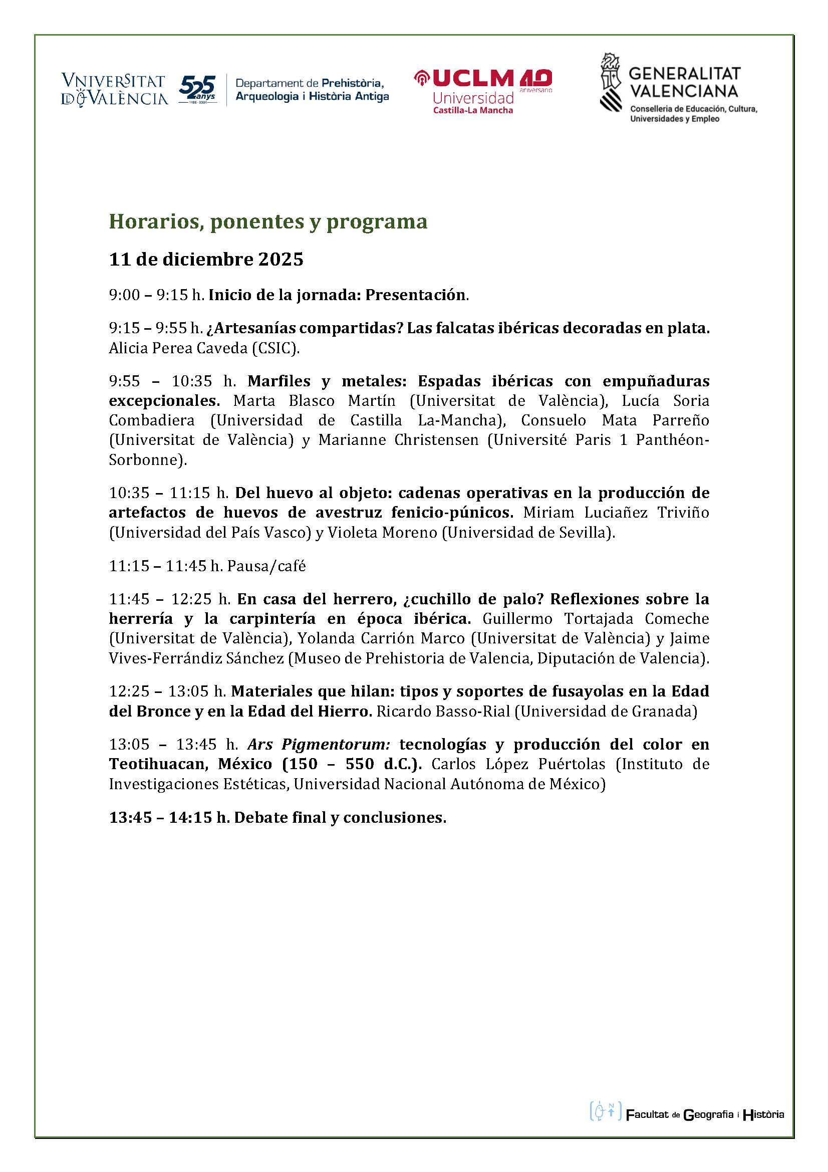 En esta jornada es reflexionarà sobre les activitats artesanals sobre diferents matèries primeres en diferents cultures del passat. La jornada s'emmarca en el projecte: “Agafar i decorar: empunyadures d'espases en època ibèrica” (CIGE/2023/76)” finançat per la Conselleria d'Educació, Cultura, Universitats i Ocupació de la Generalitat Valenciana.