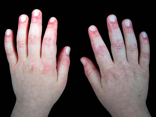 erythema and (B) scaly, red rash on the knuckles with Gottron’s papules |