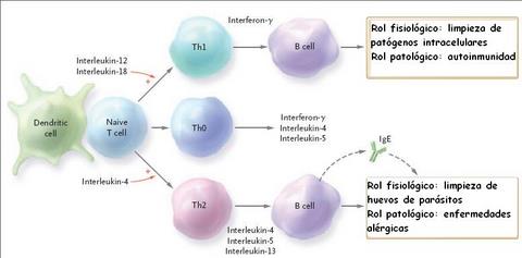 subpoblaciones de linfocitos T en la dermatitis atópica Tras el contacto con la piel, los alergenos son presentados a las células T indiferenciadas (Th0) en el ganglio linfático por parte de las células de Langerhans. Como respuesta a la presentación antigénica, las células Th (Linfocitos T cooperadores) pueden producir dos patrones de citocinas diferentes que dividen a los linfocitos T en dos subgrupos los Th1 y los Th2. Las citocinas inflamatorias involucradas en las respuestas alérgicas son producidas especialmente por el subgrupo de células Th2, mientras que las citocinas producidas por las células Th1 tienden a antagonizar las respuestas inflamatorias alérgicas. El predominio de la respuesta de células Th2 viene determinado por varios factores entre los que se incluyen el aumento de producción de IL-4, la baja producción de IL-12 por parte de las células de Langerhans y factores producidos por las células epidérmicas. Los Th2 producen varias citocinas como la interleucina 4 y la IL 13, que son potentes estimuladores de la producción de IgE y la interleucina 5 que es necesaria para el crecimiento y diferenciación de eosinófilos. Los linfocitos Th1 son producidos en presencia de niveles altos de IL-12 y producen interleucina 2, interferon γ, factor de necrosis tumoral alfa, linfotoxina, y otras citocinas que promueven las respuestas inmunes contra los patógenos intracelulares y inhiben la síntesis de IgE por parte de las células B. En las lesiones cutáneas de dermatitis atópica se encuentra un predominio de linfocitos Th2, lo cual produciría una producción aumentada de interleucina 4 y de IgE, lo que caracteriza a las fases agudas de la enfermedad |