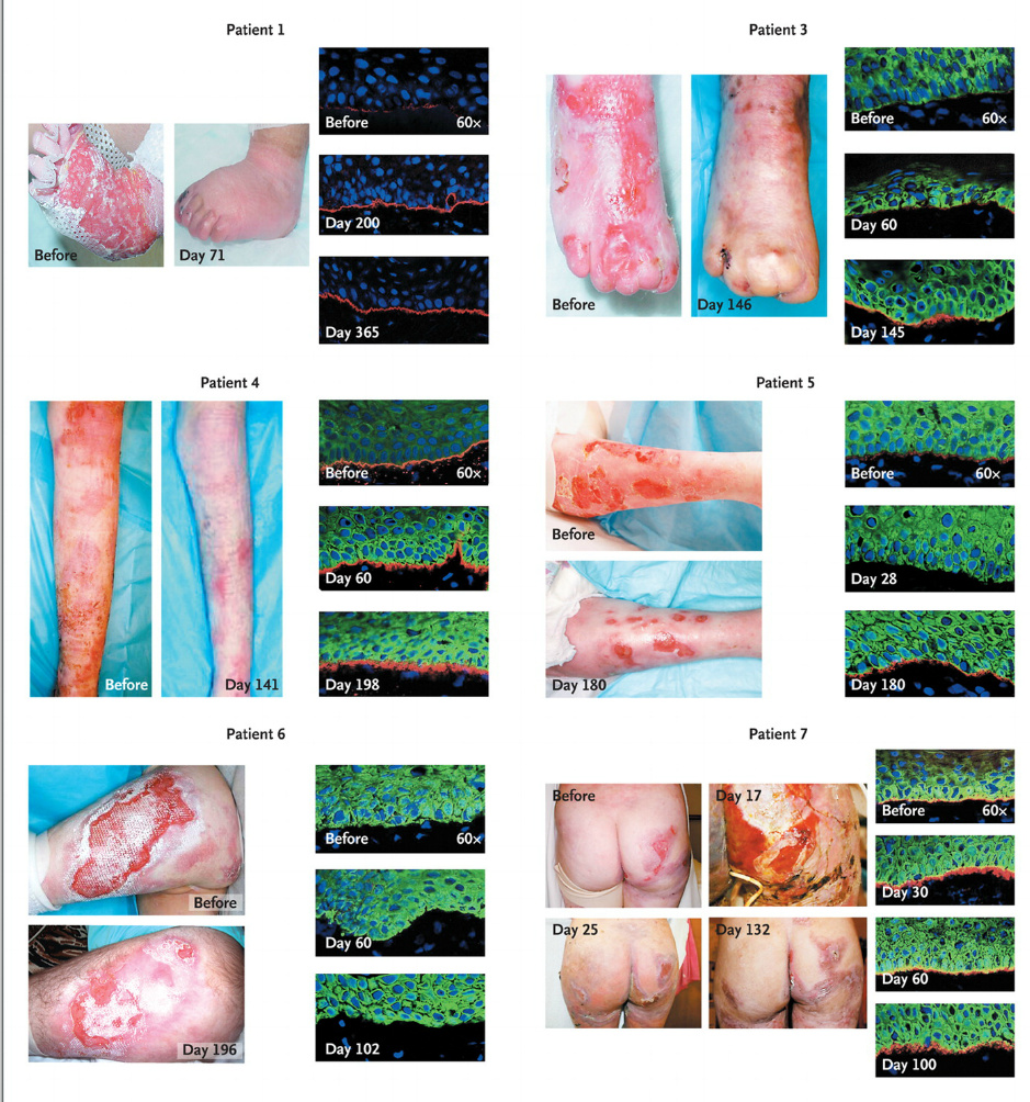 ![]() Figure 1. Clinical Photographs and Skin-Biopsy Specimens before and after Transplantation in Six Patients with Recessive Dystrophic Epidermolysis Bullosa. Photographs and skin-biopsy specimens were taken immediately before treatment and at scheduled time points after transplantation. The clinical photographs show specific areas that were consistently blistered before treatment. More rapid wound healing and reepithelialization were noted after transplantation in all six patients, with variable reductions in skin blistering. In Patient 7, marked cutaneous toxicity developed (presumably as a result of the chemotherapy) and was most pronounced on day 17 after transplantation but showed marked improvement by day 25. Immunofluorescence staining for C7 was carried out with skin-biopsy specimens obtained from all six patients, with the use of anti-C7 antibodies provided by Drs. D.T. Woodley and M. Chen (Keck School of Medicine, University of Southern California) for Patient 1 and purchased from BD Biosciences for the other five patients. For Patient 1, immunofluorescence staining before transplantation revealed faint, stippled labeling of C7; continuous, bright, linear C7 labeling was observed at all time points after bone marrow infusion. For Patient 3, faint, stippled C7 labeling was also observed at the dermal–epidermal junction before transplantation and through day 60 after transplantation, with continuous, bright, linear C7 labeling noted on day 145. For Patient 4, a bright, continuous band was observed at the dermal–epidermal junction before transplantation, with the use of anti-C7 antibody from BD Biosciences, whereas a thicker, brighter band was noted on day 198 after transplantation; this observation was confirmed with the use of LH7.2 anti-C7 antibody from Sigma-Aldrich, with no labeling before transplantation but bright labeling on day 198. For Patient 5, faint, stippled C7 labeling was observed at the dermal–epidermal junction with loss of demonstrable C7 labeling early after transplantation (day 28); however, continuous, bright linear, C7 labeling was observed on day 180. For Patient 6, no immunofluorescence staining was detectable before transplantation or at any time after transplantation, through day 102. For Patient 7, immunofluorescence staining before transplantation revealed stippled C7 labeling and continuous, bright, linear C7 labeling at the dermal–epidermal junction as early as day 30 after transplantation. For Patients 3 through 7, keratinocytes (green) were visualized with the use of anti–cytokeratin 5 antibody. |