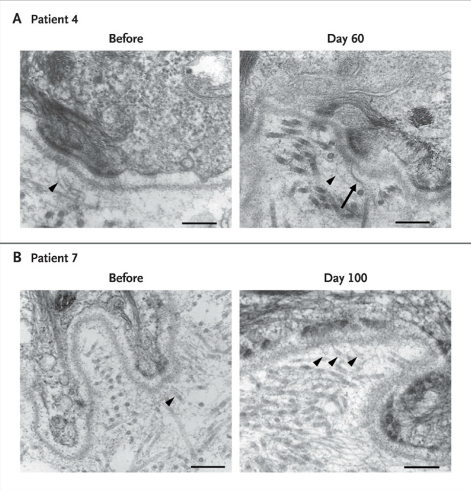 Skin Specimens from Patients 4 and 7.![]() Photomicrographs show thin fibrillar structures beneath the lamina densa before transplantation and on day 60 after transplantation in Patient 4 (Panel A, arrowheads) and before transplantation and on day 100 in Patient 7 (Panel B, arrowheads), with an increase in the number of fibrils after transplantation. Although some of these fibrils appear somewhat thicker in Patient 4 than in Patient 7 (Panel A, arrow), none bear the ultrastructural hallmarks of normal anchoring fibrils. The bars represent 250 nm. |
