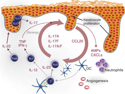 Este modelo incluye el núcleo de los elementos inflamatorios que establecen un ciclo autoalimentado, incluyendo el sesgo de las células T indiferenciadas hacia células T helper 17 (Th17) en presencia de la IL-23 que promueve la producción local de los ligandos de IL-17. Los queratinocitos a su vez son estimulados por estos ligandos de IL-17, produciendo un programa de diferenciación aberrante y una producción elevada de factores proinflamatorios incluyendo los péptidos antimicrobianos (AMPs) y quimiocinas (incluyendo CCL20, que a su vez atrae tanto las células Th17 y las células dendríticas). Estos factores derivados de los queratinocitos a su vez estimulan la atracción de más células inflamatorias, incluyendo células productoras de IL-17 y establecen una circuito autoalimentado . |