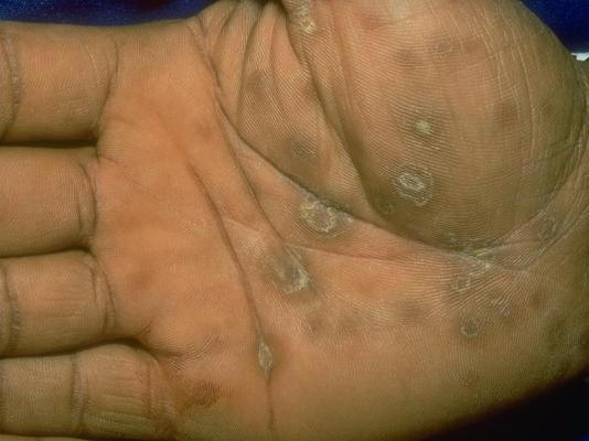 Caso clínico 10. Paciente que consulta por las lesiones que observas en la imagen y que tienen una distribución simétrica con afectanción de ambas palmas y plantas