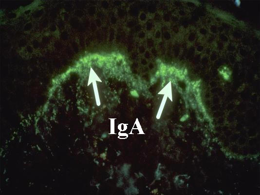 Caso 5. Paciente que consulta por prurito intenso de varios años de evolución. El examen clínico muestra las lesiones que se observan en la imagen. La realización de una inmunofluorescencia directa en piel muestra los hallazgos que se observan en la segunda imagen