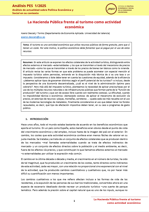 (2025). ArticleEn este artículo se exponen los efectos colaterales de la actividad turística, distinguiendo entre efectos externos al mercado –externalidades- y los que se transmiten a través del mecanismo de precios de mercado –como los que se transmiten a través de los precios de bienes tan básicos como la vivienda. El artículo revisa las varias formas en que este problema se puede acometer con especial mención al impuesto turístico sobre pernoctas, entrando en la disquisición más técnica de si es una tasa o un impuesto. Consideramos si éste debe tener en cuenta las cuestiones de equidad, además de la eficiencia -¿debemos aplicar tipos de gravamen distintos según el perfil potencial de los turistas?- e...