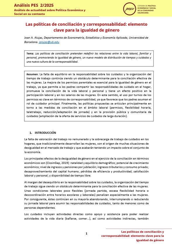La falta de equilibrio en la responsabilidad sobre los cuidados y la organización del tiempo de trabajo continúa siendo un obstáculo determinante para la conciliación efectiva de las mujeres. La mejora de los permisos parentales es esencial para la igualdad de género en el trabajo, ya que permite a los padres compartir las responsabilidades de cuidado en el hogar, promueve la conciliación de la vida laboral y personal y tiene un efecto positivo en la participación laboral y en los salarios de las mujeres. En este sentido, el uso por turnos de los permisos es clave en términos de corresponsabilidad, ya que favorece que los padres asuman el rol de cuidador principal. Finalmente, las políticas propuestas se articulan principalmente en torno a las medidas de conciliación en el ámbito laboral (permisos, flexibilidad horaria, teletrabajo, reducción/adaptación de jornada) y en la provisión pública y comunitaria de cuidados (ampliación de la oferta de servicios de cuidados de larga duración).