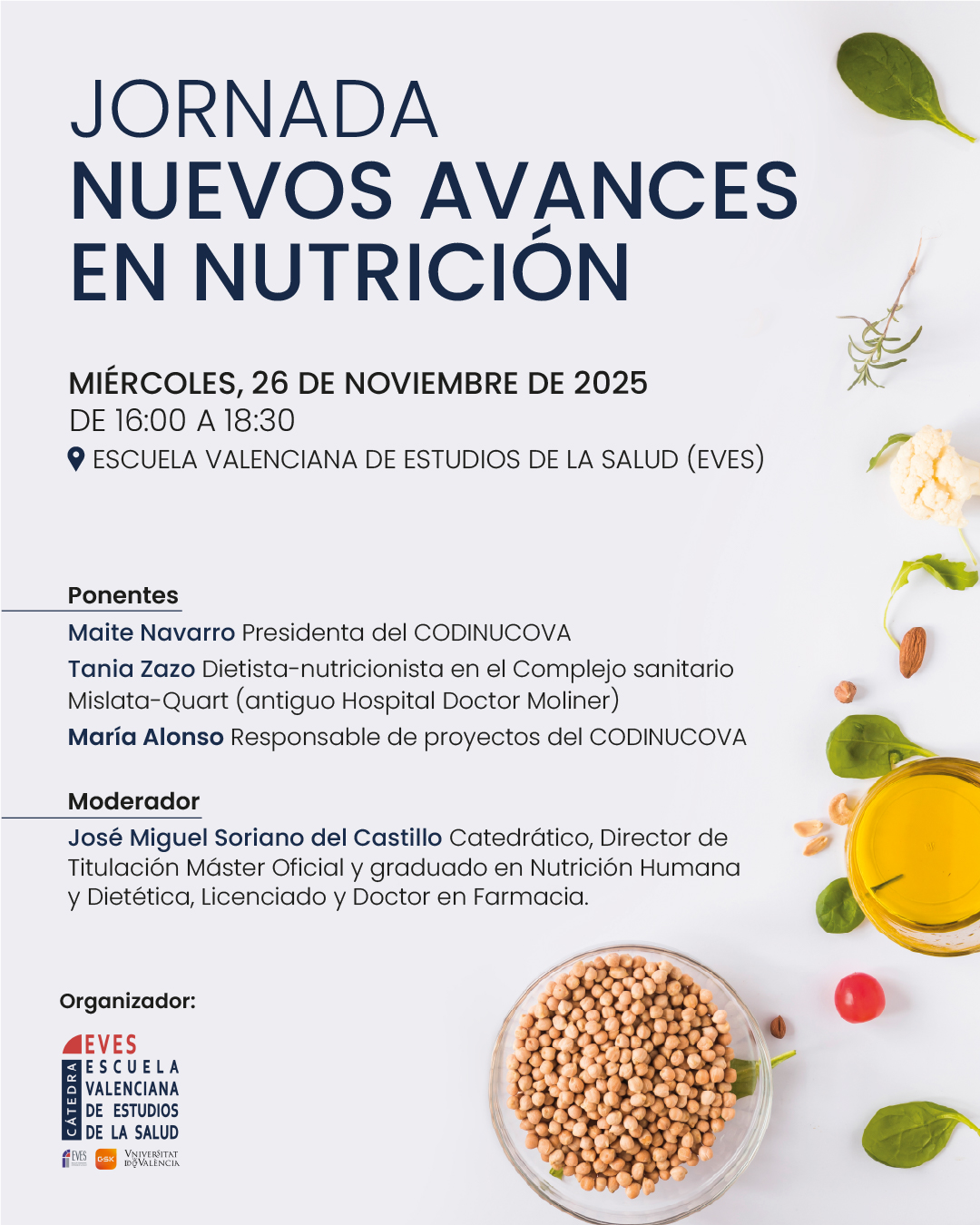 Des de la Càtedra EVES-GSK-UV celebrarem el pròxim dimecres 26 de novembre de 2025, de 16.00 a 18.30 h, la jornada “Nous avanços en nutrició”, que tindrà lloc a l’Escola Valenciana d’Estudis de la Salut (EVES).