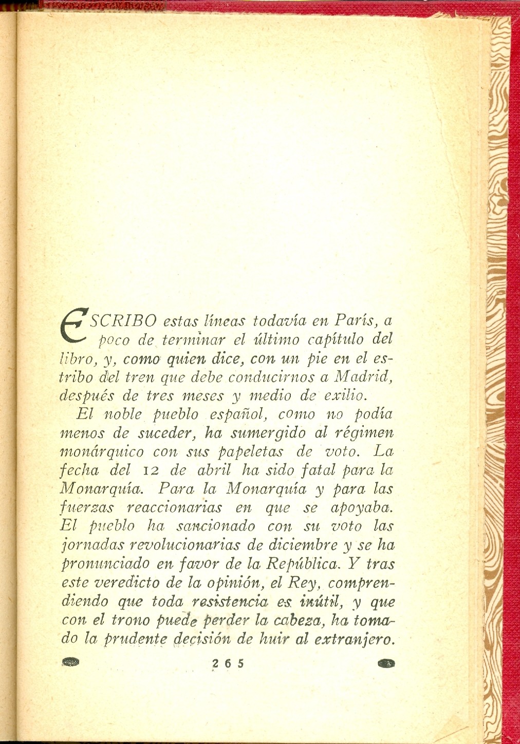 El epílogo está fechado en París el 15 de abril de 1931 y en él expresa las esperanzas abiertas por la proclamación del nuevo régimen.