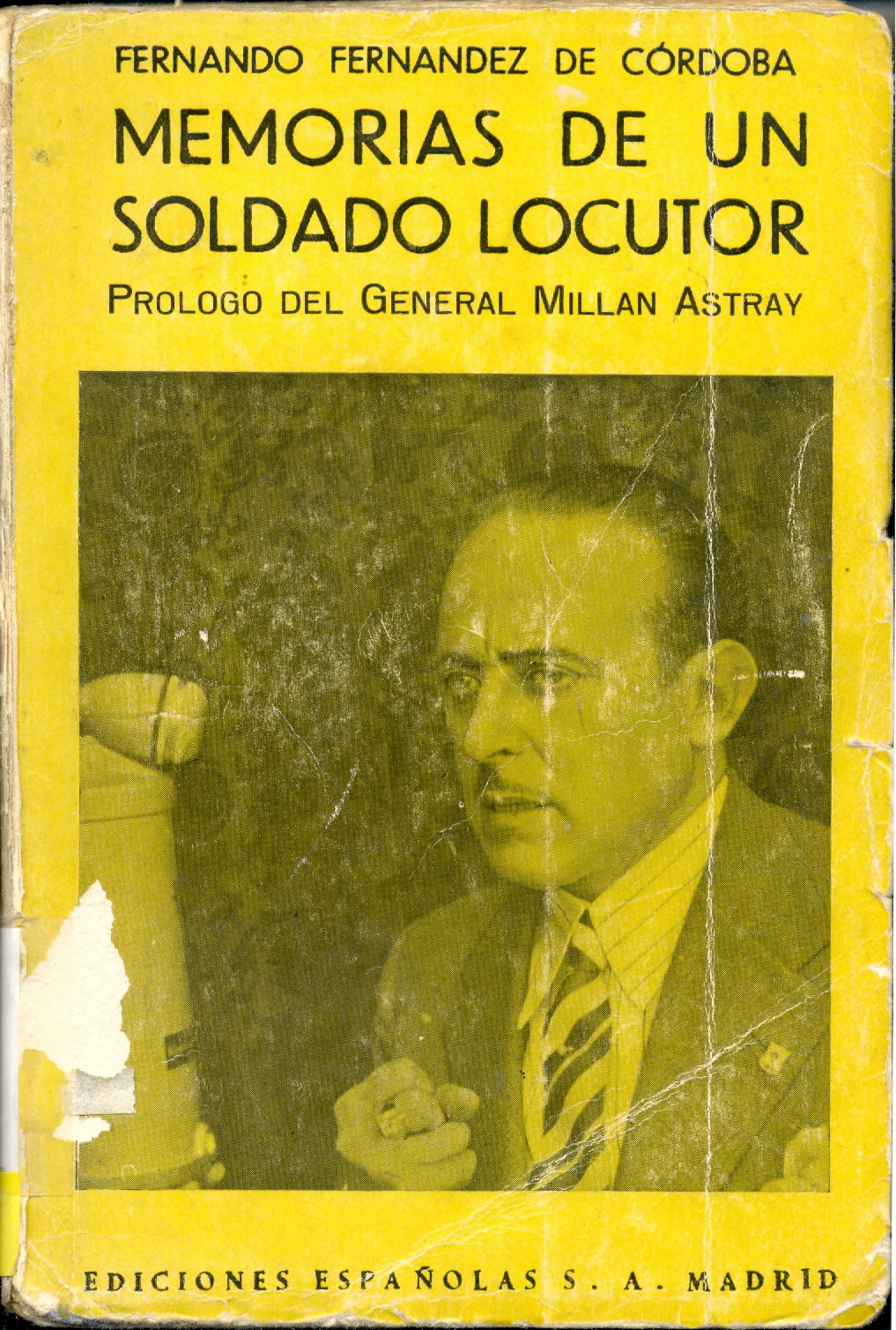 Si hay una voz ligada al régimen político franquista ésta es, sin duda, la de Fernando Fernández de Córdoba (1897-1982), la voz del NO-DO (Noticiarios y Documentales). De actor-galán pasó a locutor de los partes de guerra de la zona nacional para, terminada la guerra civil, vincularse definitivamente a los noticiarios cinematográficos. Esa evolución la narra el propio Fernández de Córdoba en este diario que lleva por subtítulo “la guerra que yo he vivido y la guerra que yo he cantado”. Tal como explica en el prólogo el coronel José Millán Astray su acento de lectura alegre, vigoroso, con tonalidad metálica, robusta y firme que emitió a través de la naciente Radio Nacional de España, enaltecía un espíritu combatiente en una población en guerra. Una voz al servicio de una ideología que fue utilizada para hacer proselitismo también entre el público infantil a través de las ondas radiofónicas. Respecto a esta edición, el libro fue publicado en octubre de 1939, es decir, recién terminada la Guerra Civil Española (1936-1939) y era una manera de recordar la victoria y el servicio a la causa nacional desde de fuera de las trincheras. El mismo autor así lo manifiesta en una dedicatoria impresa al Regimiento de Infantería Toledo, número 26, como forjador de su espíritu nacionalpatriótico que, en la fotografía de la cubierta no deja ninguna duda, al mostrar a Fernando Fernández de Córdoba en una actitud resuelta con el puño fuerte levantado ante su arma: el micrófono. En definitiva, un documento de indudable valor histórico para adentrarse en los mecanismos de propaganda política franquista durante la guerra. Por último, sobre el ejemplar, hay que resaltar que no se encuentra en muy buen estado de conservación pues a la escasa calidad del papel, acentuada por el ataque de agentes patógenos, hay que añadir el desgaste producido por del uso cotidiano. Una edición encuadernada en papel de la que sobresalen las solapas interiores; en ellas se adjuntan nuevos títulos de la editorial, todos sobre el desarrollo del bando vencedor, desde diferentes puntos de España, de la recién terminada Guerra Civil.
