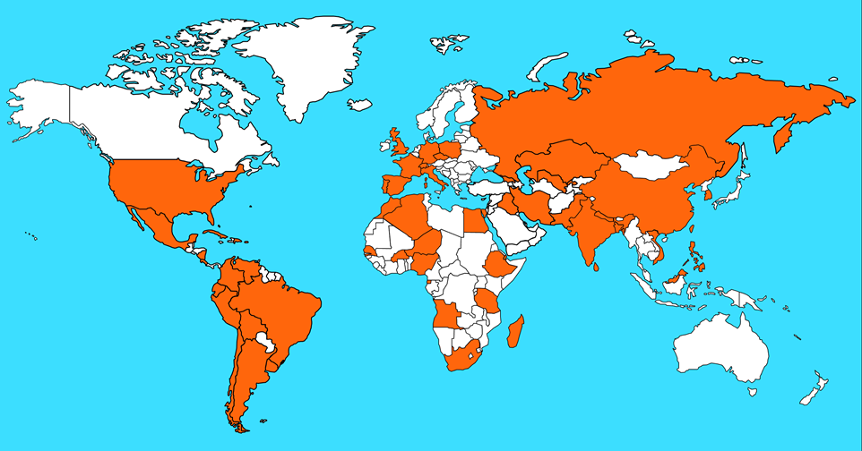 - Asia: Rusia, Georgia, Irán, Irak, Pakistán, Kazakhstan, Uzbekistan, India, Bangladesh, Nepal, Sri Lanka, Vietnam, Korea, China, Hong Kong, Taiwan, Malasia-Sarawak, Guam, Filipinas.