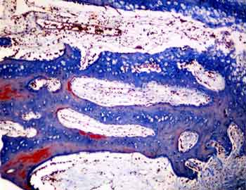Visión específica: a mayores aumentos veremos matriz ósea, tras la desmineralización, de color azulado, y en su interior osteocitos. En la superficie de las trabeculas en formación ribetes epiteloideos de osteoblastos se encargan de ir incrementando el tamaño del hueso en formación. En otras áreas ya se han iniciado los mecanismos resortivos del hueso a expensas de la actividad de los osteoclastos, células multinucleadas gigantes de origen monocítico. El tejido circundante muy bien vascularizado esta poblado por células indiferenciadas que en las proximidades a la zona ósea en formación. Se tratan de elementos osteoprogenitores, y de ellas derivara todo el linaje de los osteoblastos, osteocitos y células de las superficies óseas, siendo estas ultimas las quiescentes a la espera de activarse como respuesta a la información que reciben del entorno, fundamentalemente de los osteocitos intramatriciales.