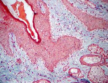 Visión específica: se identifica un epitelio plano pluriestratificado con diferenciación queratínica en superficie. Cuando realizamos la observación del área epitelial de superficie vemos que las células se disponen en 6-8 estratos, más por la disposición de los núcleos que no por los límites celulares, que no están bien definidos. Por su morfología y posición se identifican el estrato basal de células pequeñas y cúbicas, el espinoso constituido por células poliédricas de mayores dimensiones, el granuloso constituido por una o dos capas celulares prácticamente planas y el queratinizado en superficie con pérdida de los núcleos. En el caso del presente preparado por tratarse de una piel gruesa la cantidad de queratina en superficie es muy importante. El conjuntivo es densamente fibroso y con abundantes nervios, vasos sanguíneos de diferentes calibres, tejido adiposo blanco y glándulas sudoriparas.