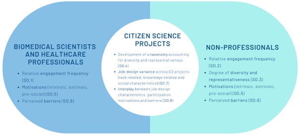 - O2: Analizar las motivaciones y barreras que experimentan los científicos biomédicos y los no profesionales para participar en diferentes tipos de proyectos de ciencia ciudadana.