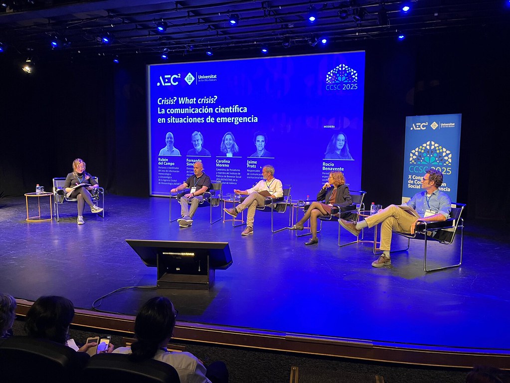 El 29 d’octubre vaig tindre l’oportunitat de participar en la taula redona “Crisis? What crisis? La comunicació científica en situacions d’emergència”, en què vaig compartir sessió amb Rubén del Campo, portaveu d’AEMET; Fernando Simón, director del Centre de Coordinació d’Alertes i Emergències Sanitàries (CCAES); i Jaime Prats, responsable de comunicació institucional del CSIC. La periodista científica Rocío Benavente, especialitzada en verificació i desinformació a Maldita.es, va moderar la sessió de manera excel·lent.