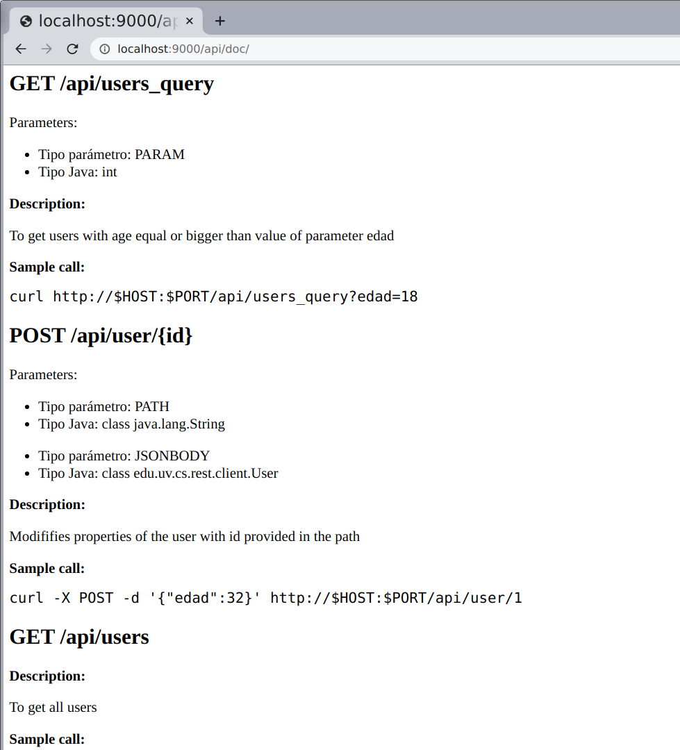 package edu.uv.cs.rest.client; import java.util.List; import edu.uv.cs.rest.lib.FileBody; import edu.uv.cs.rest.lib.JSONBody; import edu.uv.cs.rest.lib.MultipartBody; import edu.uv.cs.rest.lib.PathVar; import edu.uv.cs.rest.lib.Param; import edu.uv.cs.rest.lib.ApiDoc; import edu.uv.cs.rest.lib.RestEndPoint; public interface UserEndPoint{ @RestEndPoint(method="GET",url="/api/users") @ApiDoc(cli="curl http://$HOST:$PORT/api/users", desc="To get all users") public List<User> get(); @RestEndPoint(method="GET",url="/api/users_query") @ApiDoc(cli="curl http://$HOST:$PORT/api/users_query?edad=18", desc="To get users with age equal or bigger than value of parameter edad") public List<User> getEdadMayorQue(@Param(name="edad") int edad); @RestEndPoint(method="GET",url="/api/user/{id}") @ApiDoc(cli="curl http://$HOST:$PORT/api/user/1", desc="Returns the user with the id provided in the path") public User get(@PathVar(name="id") String id); @RestEndPoint(method="PUT",url="/api/user") @ApiDoc(cli="curl -X PUT -d '{\"name\":\"juan\",\"email\":\"juan@dev.null\",\"year\":2000}' http://$HOST:$PORT/api/user", desc="Adds the user passed in the body of the request") public User put(@JSONBody User s); @RestEndPoint(method="DELETE",url="/api/user/{id}") @ApiDoc(cli="curl -X DELETE http://$HOST:$PORT/api/user/1", desc="Deletes the user with the id provided in the path") public void delete(@PathVar(name = "id") String id); @RestEndPoint(method="POST",url="/api/user/{id}") @ApiDoc(cli="curl -X POST -d '{\"edad\":32}' http://$HOST:$PORT/api/user/1", desc="Modififies properties of the user with id provided in the path") public void modify(@PathVar(name="id") String id, @JSONBody User s); @RestEndPoint(method="POST",url="/api/user/{id}/photo") @ApiDoc(cli="curl -F\"file=@/path/file.jpg\" http://$HOST:$PORT/api/user/1/photo", desc="Adds a photo to the user with id provided in the path. The image is uploaded in the body of the request as multipart/form-data") public void addPhoto(@PathVar(name="id") String id, @FileBody MultipartBody MultipartBody); }