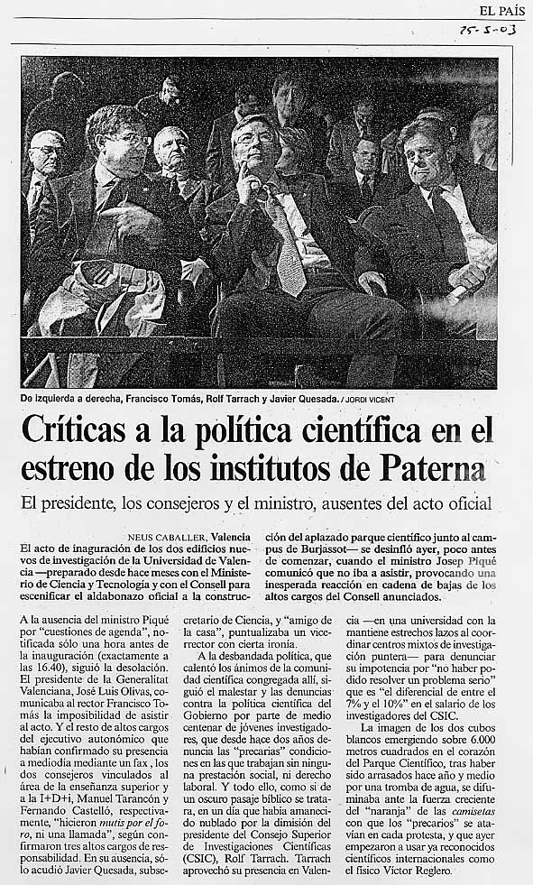 "Críticas a la política científica en el estreno de los institutos de Paterna" |