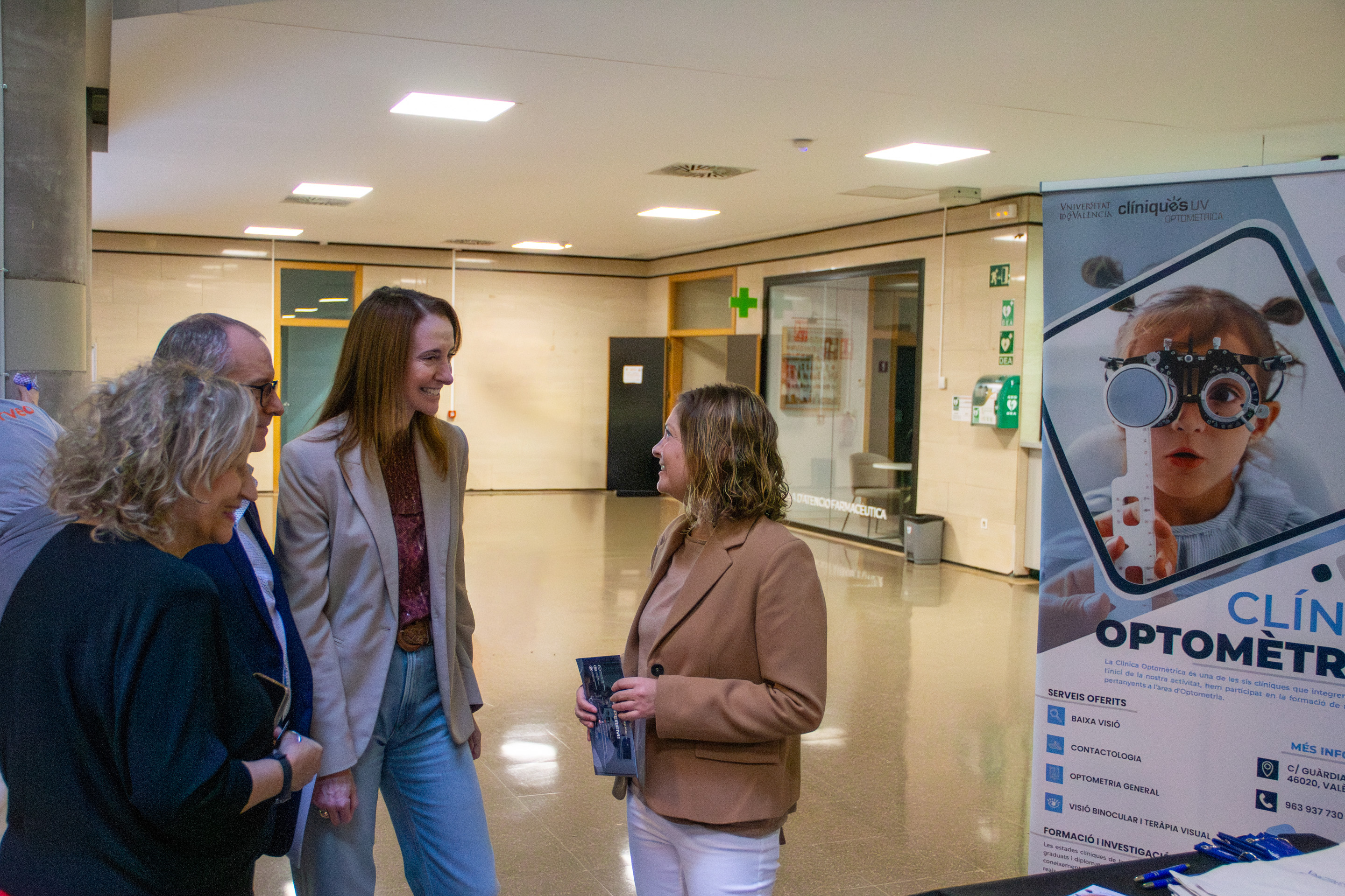 En la part final del matí, l’estudiantat va poder visitar els diferents estands d’empreses i entitats participants, entre elles la Clínica Optomètrica UV, representada per la seua directora Amparo Rodrigo, que va compartir espai amb el Màster Universitari en Optometria Avançada i Ciències de la Visió. Durant la jornada, la vicerectora de Formació Permanent, Transformació Docent i Ocupació, Ángeles Solanes, el Degà de la Facultat de Física , Enric Valor i la Degana de la Facultat de Farmàcia i Ciències de l’Alimentació, Hortensia Rico, van visitar l’estand, mostrant el seu suport a les iniciatives que connecten la formació universitària amb l’ocupació.