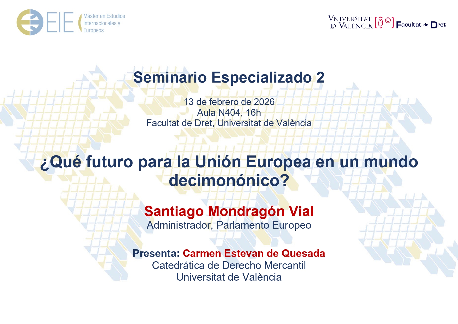 El próximo viernes 13 de febrero, a las 16:00h en el Aula N404 (Facultat de Dret), tendrá lugar el segundo seminario especializado del curso 2025/2026. Santiago Mondragón Vial, Administrador en el Parlamento Europeo, impartirá la conferencia titulada "¿Qué futuro para la Unión Europea en un mundo decimonónico?". El acto será presentado por la Catedrática Carmen Estevan de Quesada.