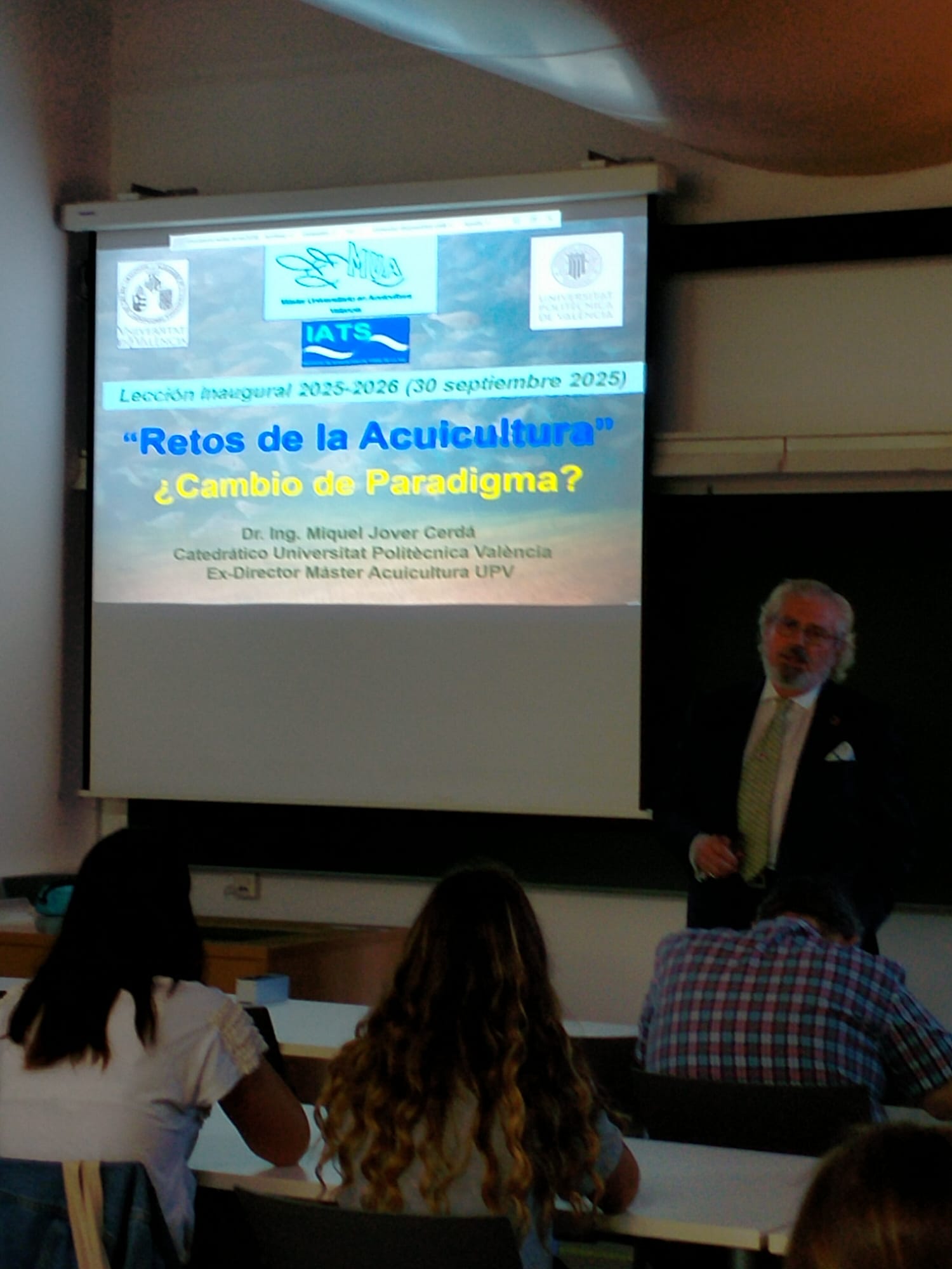 Tras un espacio de preguntas del alumnado, el catedrático de la UPV Miguel Jover impartió la charla titulada "Retos de la Acuicultura: ¿Cambio de paradigma?".