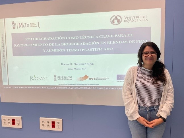 • Karen Gutiérrez presented the effects of UV-C irradiation as a key tool for accelerating photodegradation in PBAT and thermoplastic starch blends, showing significant surface deterioration of the material.