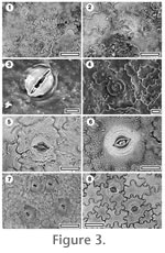 Referred specimens and occurrence: SL1709, Sthd-019; SL2035, Sthd-046. Referred specimens and occurrence: Epidermis not divided into costal and intercostal zones (stomata evenly spread). Stomatal complex construction apparently paracytic, although subsidiary cells not clearly staining more than normal epidermal cells, not in rows, randomly oriented, stomata circular, but not clearly outlined, diameter 14-23 µm (medium). Outer stomatal ledge cuticle markedly thicker than normal epidermal cells, broad in centre and narrowing distinctly toward the ends, with slit-like, elongate aperture. Subsidiary cells each with a single arching ridge of cuticle (Figure 3.3), following the guard cells, but not meeting at the poles. Epidermal cells clearly visible under TLM, isodiametric, sinuous, slightly buttressed, glabrous, not papillate. Identification: Pole (1993b) described Early Miocene leaf impressions from Bannockburn that were indistinguishable from the extant New Zealand Rhipogonum scandens and therefore identified them as the living species. Later, leaves with similar architecture were found with cuticle at the Early Miocene locality of Foulden Hills (Pole 1996). The cuticle details confirmed the identification (but note that figures 11c, d in Pole 1996 inadvertently lack captions. They are of extant Rhipogonum scandens). The specimens in this study are dispersed cuticle only, and without the benefit of leaf architectural a broader range of possibilities must be considered for identification. The Rhipogonaceae and Smilacaceae are two of the "net-veined" monocots (Inamdar et al. 1983) and as such, they do not have stomata and epidermal cells arranged in rows like parallel-veined monocots. However, they both have similar epidermal features which makes them clearly recognisable, although hard to tell from one another. Both have paracytic stomatal complexes where the subsidiary cells are generally slightly thicker than normal epidermal cells, of uneven size, and with an irregular outer wall, and the epidermal cells are highly sinuous. The dispersed fossil material clearly fits this basic morphology. Based on the species available in the extant reference collection (seven species of Rhipogonum and nine of Smilax), in general, Smilax species tend to have thin, or poorly defined epidermal cell anticlinal walls, poorly defined margins to generally elliptical stomata which are 20-35 µm in greatest diameter (medium-sized). In contrast, Rhipogonum tend to have much stronger or clearly defined epidermal cell anticlinal walls, and well-defined margins to generally circular stomatal which are 28-43 µm in diameter (from medium to large) (see Figure 3.7-3.8). The new fossil is consistent with Rhipogonum, although there are subtle, but consistent differences with the R. scandens (Figure 3.5). In the fossil, the pair of ridge-arcs flanking the stomata is more prominent, and the stomata are slightly smaller. Without leaf architectural details it is inadvisable to place the dispersed cuticle fragment into an extant species. Very similar cuticle is also present in the Early Eocene of Regatta Point, Tasmania.