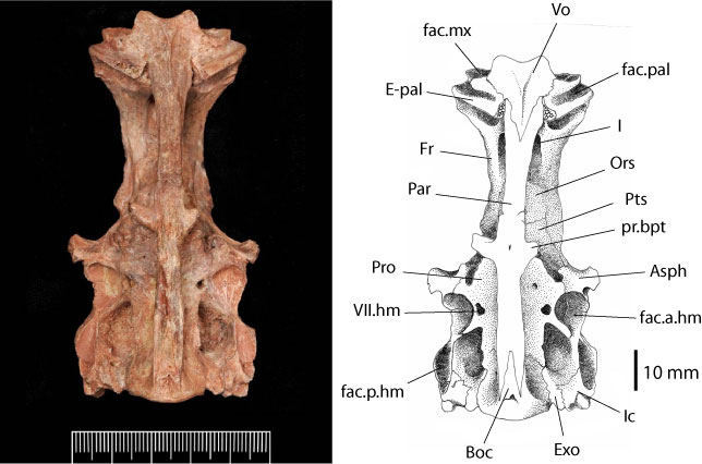 FIGURE 5. Cladocyclus pankowskii sp. nov. USNM PAL 521360 braincase in ventral view together with interpretive camera lucida drawing. Scale bar in millimeters. Abbreviations: Asph, autosphenotic; Boc, basioccipital; E-pal, ethmopalatine; Exo, exocciptal; fac.a.hm, anterior facet for hyomandibula; fac.mx, facet for maxilla; fac.pal, facet for palatine; fac.p.hm, posterior facet for hyomandibula; Fr, frontal; Ic, intercalar; Ors, orbitosphenoid; Par, parasphenoid; pr.bpt, basipterygoid process; Pro, prootic; Pts, pterosphenoid; Vo, vomer; I, foramen for the olfactory tract; VII.hm, foramen for hyomandibula trunk of the facial nerve.