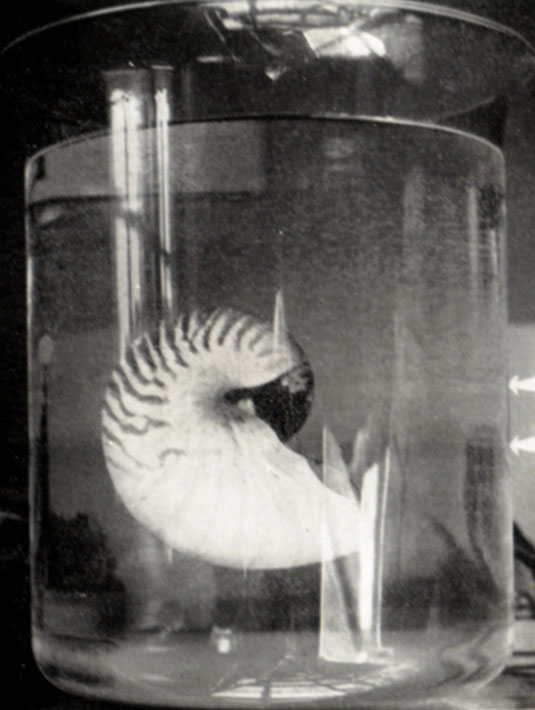 Figure 3. Detail of a laboratory experiment showing an almost waterlogged shell of Nautilus pompilius floating on the interface between freshwater (above) and water of normal marine salinity. The white arrows to the right mark the narrow zone of mixing between saline water and fresh water.