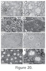 Stomatal complexes. Stomatal complexes evenly spread, isolated, randomly oriented, brachyparacytic, size range unimodal (but with wide range of stomatal size). Subsidiary cells length 32–40 µ (large), or (medium), periclinal walls thinner than normal epidermal cells. Guard cell pair very narrow, poles sharply reflexed outwards, overarched by the subsidiary cells (not exposed on the surface). Epidermal Cells. Epidermal cell flanges clearly visible using TLM, normal cells highly variable from isodiametric to elongate (cells over veins not distinguished by shape), approximately the same size as the stomata, anticlinal walls straight, unbuttressed, smoothly textured, unornamented. Indumentum. Hirsute, densely covered with stellate trichomes, inserted over, or the outgrowth of, a single modified epidermal cell, similar in size to a normal epidermal cell. Distinguishing features. Distinguished by the unique combination of brachyparacytic stomatal complexes (a pair of narrow guard cells flanked by a broad subsidiary cell on either side) and stellate/multibranched trichomes. Identification. The basic stomatal morphology is comparable with the Lauraceae. However, the stellate trichomes indicate it clearly belongs to Notothixos (Viscaceae), a mistletoe (see Barlow 1983 for more details on the trichomes). It may be compared closely with extant N. subaureus Oliver (1863) (Fig. 16.7-16.8).