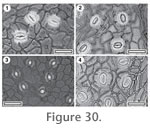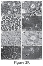 CUT-Z-GDC Reference Specimen and locality: SL1222, BL-30. Stomatal complexes. Stomatal complexes in areoles, isolated (but very rare networking noted), randomly oriented, actinocytic, or staurocytic, size range unimodal. Subsidiary cells (4–5) isodiametric, periclinal walls thicker than over normal epidermal cells, smooth, unornamented. Guard cell pair outline circular, or ovate, outlined by a well-defined anticlinal wall, at same level as subsidiary cells (exposed on surface), length 28–32 µ (medium), with prominent T-piece thickenings at polar ends. Outer stomatal ledge sub circular, much thicker than normal epidermal cells, extending over whole stoma, with a broad, sub-circular pore. Epidermal Cells. Epidermal cell flanges clearly visible using TLM, normal cells elongate (cells over major veins more elongate, but those over finer veins inconsistently so), approximately the same size as the stomata, anticlinal walls markedly sinuous, unbuttressed, smoothly textured, unornamented. Indumentum. Attachment scars of deciduous trichomes common, scattered over venal and non-venal regions, inserted between (5–7) epidermal cells modified by several tangential divisions, with a massively thickened rim, scar diameter much smaller than a normal epidermal cell. Identification. Suggested as Sapindaceae based on broad similarity with extant species such as Rhysotoechia bifoliolata inn terms of stomatal and subsidiary cell shape and degree of thickening (Fig. 30.3). Ericaceae Jussieu 1789 Family identification: The fossil record of the Epacridaceae, which is now regarded as included within the Ericaceae (Angiosperm Phylogeny Group 2003) was summarized by Jordan and Hill (1996) and leaf cuticle of some fossil and extant species was illustrated by Jordan and Hill (1995). The stomatal complexes range from cyclocytic, to paracytic to anomocytic and are generally aligned. The epidermal cells are often (not always) highly sinuous. The tree-heath Trochocarpa has generally aligned anomocytic stomata and highly sinuous epidermal cells. For comparison two species of extant Trochocarpa, T. laurina Brown (1814) and T. bellendenkerensis Domin (1930) are illustrated (Figs 32.5 -32.6).