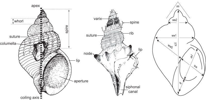 FIGURE 1. Some terminology and standard two-dimensional measurements of the gastropod shell (aa – apical angle; cl – columella length; ll – lip length; al – aperture length; aw – aperture width; ww0 – whorl width 0; ww1 – whorl width 1; ww2 – whorl width 2).