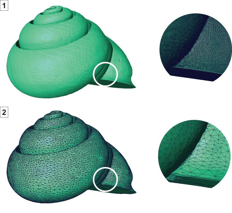 FIGURE 10. Triangular mesh of the internal volume of the gastropod shell. The internal volume of the shell is described as a connected array of triangles placed at the boundary between the shell and its internal mould. 1. High resolution model with about 4.3 millions of triangles. 2. Surface simplified to about 0.05 millions of triangles.