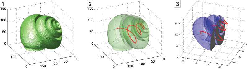 FIGURE 11. Curve-skeleton of the internal volume of the gastropod shell reconstructed by means of the potential field method. 1. Voxel grid of the internal volume of the shell. 2. Translucent view of the internal volume of the shell with the curve-skeleton. 3. Cut shell with the curve-skeleton.