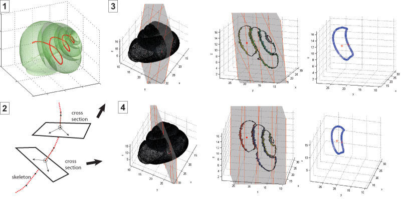 FIGURE 12. Extraction of whorl section through ontogeny by successive sections of the triangular mesh with planes perpendicular to the curve-skeleton. 1. Translucent view of the internal volume of the shell with its curve-skeleton. 2. Scheme illustrating two successive cross-sectioning planes perpendicular to and placed along the curve-skeleton. 3, 4. The results of the two cross-sectioning planes, respectively: left figure shows the triangular mesh of the shell and the cutting plane; middle figure shows the triangles of the mesh which intersect the cutting plane; and right figure shows the resulting outline of the whorl section at each examined ontogenetic stage.