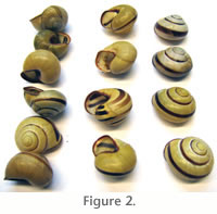 The proposed morphometric approach has been established with gastropods of the family Helicidae (Gastropoda, Stylommatophora). Studied specimens are tightly coiled and slightly trochospiraled with a large overlap of successive whorls. All studied specimens come from and are deposited in the Zoological Museum of the University of Zürich. The different steps of the method will be illustrated with the case of one specimen belonging to the species Cepaea nemoralis (Linnaeus 1758). This grove snail or brown-lipped snail is a terrestrial pulmonate gastropod. It is one of the most common species of land snails in Europe. It is a relatively small snail, growing to a height of about 20 mm and a width of 25 mm. The semi-glossy shell grows up 4½ to 5½ whorls (Figure 2).