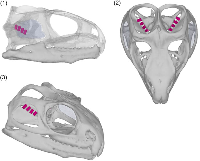 FIGURE 11. mPPt (1) Lateral view with the skull at 80% transparency; (2) dorsal view with a slight anterior tilt; (3) anterodorsolateral view. Where present the fascia is at 80% transparency.