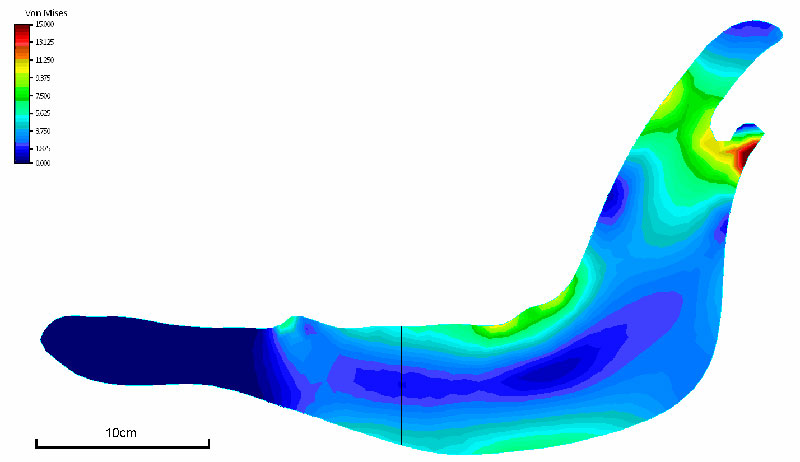 FIGURE 4. Typical jaw FE-models of Connochaetes (wildebeest, ruminant) with colour plot of Von Mises stress distribution and position of mid-toothrow transect (black line).