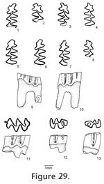 The M3 has an anterior lobe, three alternating triangles, and a posterior lobe. Labial triangles and reentrants are much smaller than lingual ones. Seventy-nine percent of M3s have the posterior islet. Three specimens (UALP 22033, 22037, and 22038) have the islet incompletely closed by having the posterior lingual reentrant slightly open. The islet will be formed with further wear. Four specimens (UALP 22031, 22032, 22034, and 22035) lack the posterior islet and have the posterior lingual reentrant open until late wear. Within these four specimens, three have a posteriorly bent Triangle 3 (Figure 29.12), as some M3s of Nevadomys cf. N. fejfari from Locality 9620. One (UALP 22032) out of 19 specimens has a small anterior islet. As in N. fejfari, the majority of M3s (88%) have only two roots.