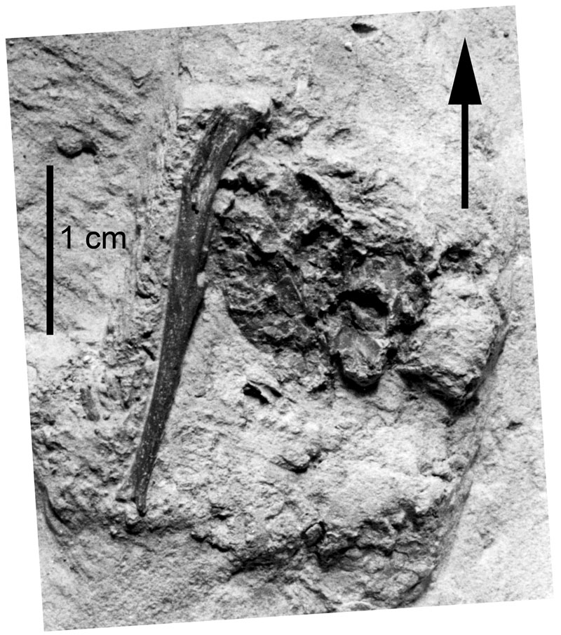 FIGURE 8.2.8. Prodipodomys tibia and possible crushed auditory bulla near the center of grid square 1S+00. In modern Dipodomys skulls found in owl pellets, the auditory bullae frequently become disarticulated from the other cranial bones.
