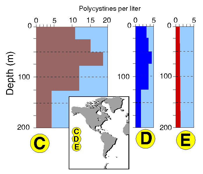 | Figure 12C-E. Vertical distribution patterns of polycystine radiolarians in various oceanic areas. In all cases total numbers of shells recorded are illustrated, which most probably significantly overestimates in situ living populations, especially below 100-200 m. From data in Renz (1976). |