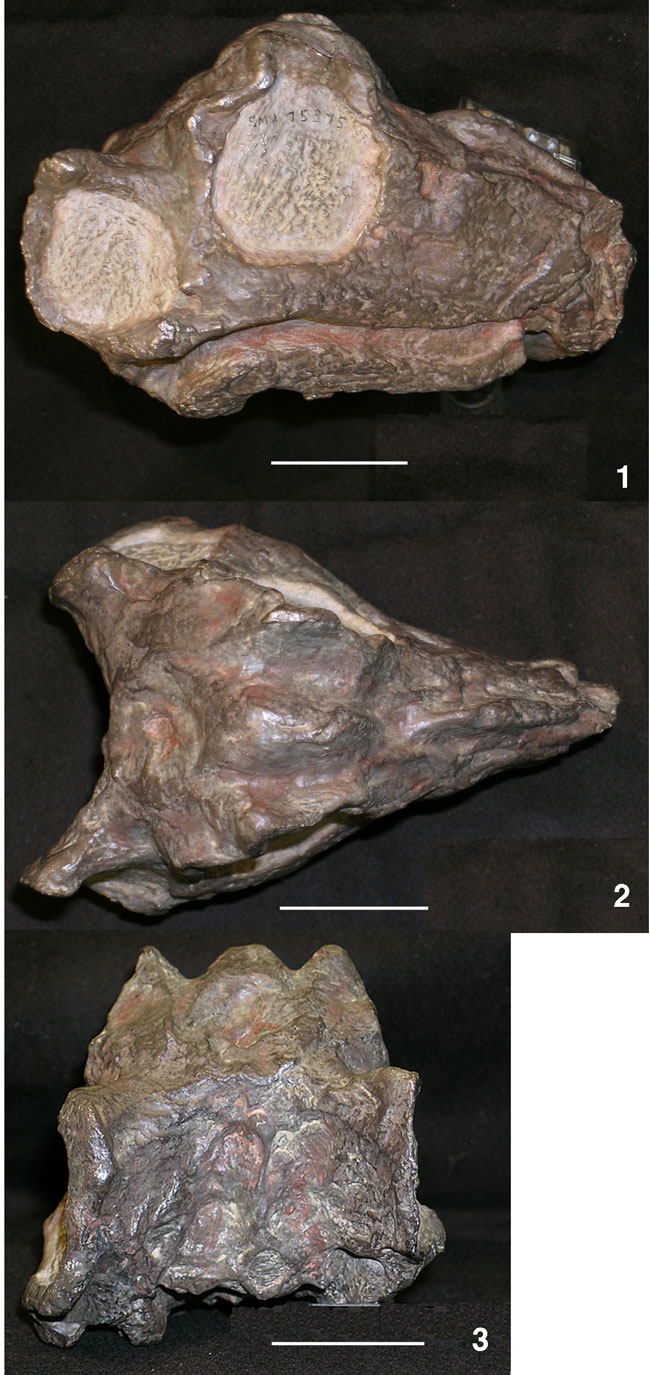 Figure 8. Unnamed burnetiid (Mal 290) from the Chiweta Beds, Malawi, (1.1) right lateral view, (1.2) dorsal view, (1.3) posterior view. Scale bars are 30 millimeters.