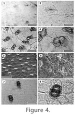 APPENDIX 1. KEY TO MONOCOT CUTICLE WITH ALIGNED STOMATES1. Stomatal complexes not visible under TLM 2. 2. Papillae or glandular trichomes present 3. 3. Glandular trichomes appear in pairs amongst normal epidermal cells CUT-Mo-EFE. 4. Epidermal cells not in clear files CUT-Mo-FEH. 5. Papillae present 6. 6. Papillae small and essentially restricted to the epidermal cells CUT-Mo-FJC. 7. Papillae mostly restricted to the subsidiary cells CUT-Mo-FFJ. 8. Papillae on subsidiary cells overarch stomatal pore 9. 9. Papillae smooth and discrete CUT-Mo-FJE. 10. Stomatal complexes distinctly straight-sided CUT-Mo-EFI. 11. Papillae high and distinct CUT-Mo-EIA. 12. Stomatal complexes in well-defined zones 13. 13. Stomatal complexes in broad zones separated by narrow non-stomatal zones CUT-Mo-EHB. 14. Stomata typically elliptical, without prominent arching lateral subsidiary cells CUT-Mo-FFA. 15. Stomatal complexes uncommon, epidermal cells isodiametric or shorter than broad CUT-Mo-EII. CUT-Mo-EEI (Rhipogonum sp.)