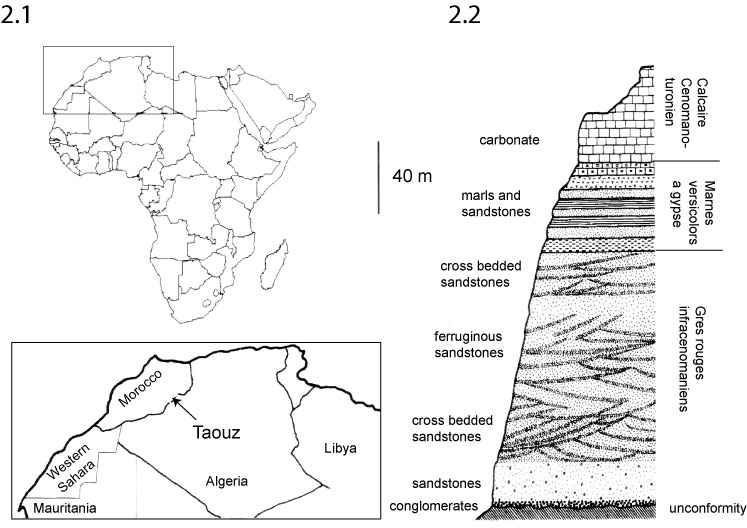 FIGURE 2. 2.1. Type locality of Cladocyclus pankowskii sp. nov. The holotype was not found in situ, and the locality may only be identified as the Taouz area. 2.2. Section through Kem Kem beds. The holotype and jaw specimen described here undoubtedly come from the ferruginous sandstone horizon. After Forey and Grande (1998).