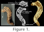 Scanning was done by Richard Ketcham at the University of Texas High-Resolution X-ray CT Facility. The specimen was first scanned with the high-energy 420-kV scanner subsystem in its longitudinal direction (Figure 1.2) to test for the presence of differentiable details. Following this successful test, the specimen was scanned perpendicular to its long axis (Figure 1.3) on 19 August 2005 using the microfocal subsystem, with X-rays set at 180 kV and 0.133 mA to provide a focal spot of 30 µm. A total of 930 1024x1024 slices were obtained with a slice thickness and inter-slice spacing of 0.1433 mm and a field of reconstruction of 66 mm (Figure 1.3, Figure 3). Image processing and visualization (Figure 1.4) was completed by Jessica A. Maisano. The scan can be examined on the DigiMorph site, an NSF Digital Library at The University of Texas at Austin.