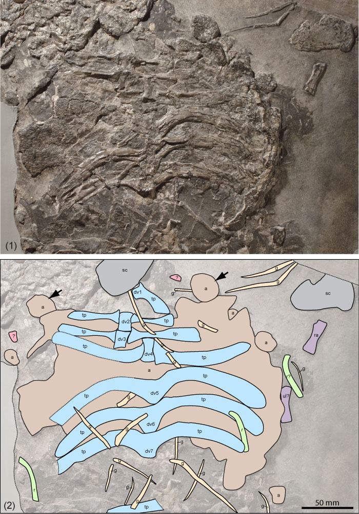 FIGURE 6. Close-up of the main carapace region of specimen PIMUZ T58 of Cyamodus hildegardis in ventral view. (1) Photograph of specimen. Note that because of technical reasons, the image is rotated 90° clockwise to the overview image in Figure 2.2. (2) Interpretative sketch of skeletal elements. Black arrows indicate the two elements previously identified as coracoids by Pinna (1992), here interpreted as being the anterior-most lateral armour plates of the main carapace. Colour code: brown: armour elements; blue: vertebral centra and transverse processes; purple: appendicular elements; grey: girdle elements; green: ribs; yellow: elements of gastral apparatus; red: unidentified elements. Abbreviations: a: armour plates; dv: dorsal vertebra; g: gastral rib; r: rib; ra: radius; sc: scapula; tp: transverse process; ul: ulna; ?: unidentified. (A greyscale version of this figure is also available).