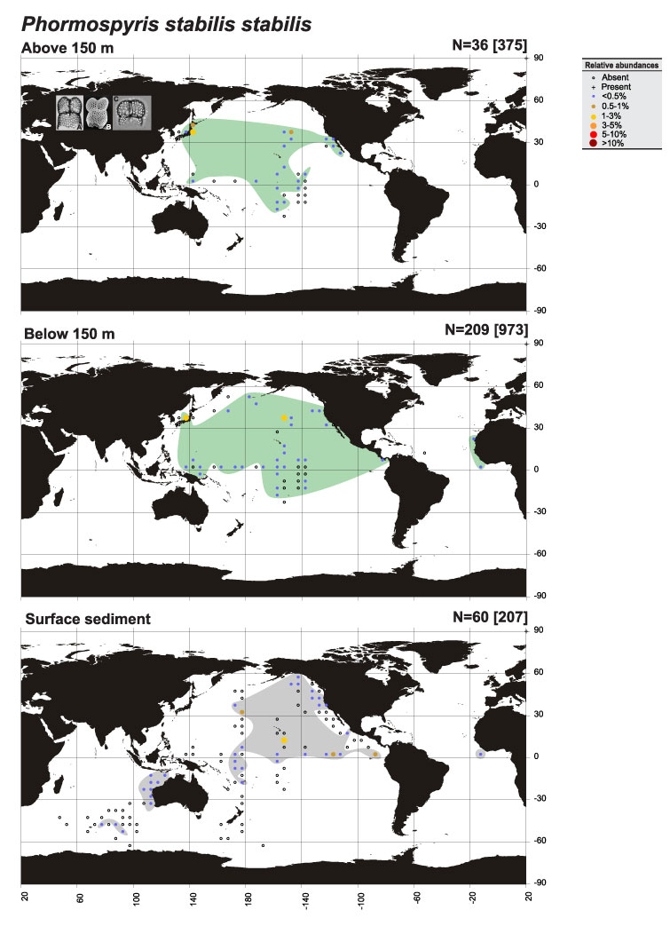 Figure 64. Geographic distribution of Phormospyris stabilis stabilis. N: total number of positive records [total number of samples where the species was presumably sought], for water-column (above 150 m and below 150 m; plankton and sediment trap materials) and surface sediment materials. Sources: A, Goll (1976); B, Original; C, Original.